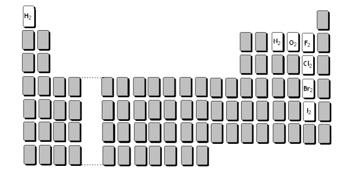 Dessa forma, nós encontramos facilmente moléculas, por exemplo, H2, O2 e N2. Além disso, é interessante para nós aprendemos como eles se localizam na Tabela Periódica. Na figura abaixo apresentamos os principais elementos que formam moléculas diatômicas. Assim, com exceção dos gases nobres que são naturalmente gases, principalmente os halogênios forma moléculas diatômicas; ou seja, são gases na temperatura ambiente.