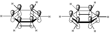 Se partirmos do princípio de que a interação entre os 2p orbitais está localizada entre um par de átomos de carbono, obtemos uma das estruturas Kekulé para o benzeno. Trocar os pares de átomos que formam ligações nos dá a outra estrutura de Kekulé.