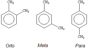 Existem três maneiras pelas quais um par de substituintes pode ser colocado em um anel aromático. No isômero orto (o), os substituintes estão em posições adjacentes no anel. No meta (m) isômero, eles são separados por um átomo de carbono. No isômero para (p), eles estão em extremidades opostas do anel. Os três isômeros do dimetilbenzeno, ou xileno, são mostrados abaixo.