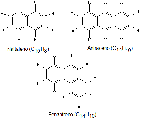 Os compostos aromáticos podem conter mais de um anel de seis membros. Naftaleno, antraceno e fenantreno são exemplos de compostos aromáticos que contêm dois ou mais anéis de benzeno fundidos.