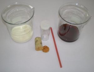 - Coloque a fatia da cortiça em cima do leite contido no recipiente incolor.