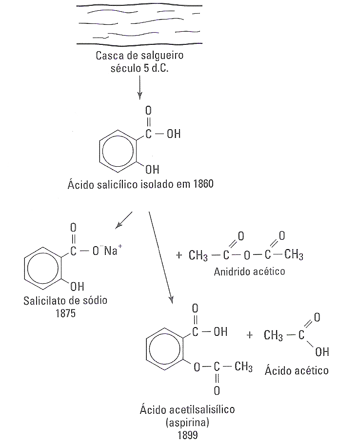 Desde o quinto século d.C. já se sabia que mastigar casca de salgueiro aliviava a dor. Por outro lado, o composto químico responsável pelo efeito analgésico, só foi isolado em 1860, que é o ácido salicílico (C₇H₆O₃). Como o sabor do ácido salicílico (C₇H₆O₃) era muito azedo e provoca irritação no estômago, em 1874 os químicos sintetizaram o salicilato de sódio (C7H5NaO3) em 1874.