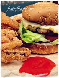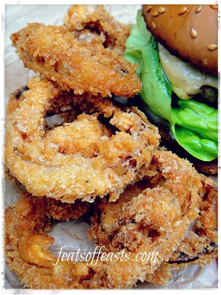 Despite the vague rating of my pork burger, there is something that I’m really happy about which is my fried onion rings. I made some improvements from the last time I cooked these rings and this time I can happily say I’m satisfied with the results. They’re crunchy but not so battered that you can’t taste the onions. I’ve always felt that onion rings on fast food joints taste so artificial to the extent I wonder if those onions are actually real.