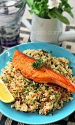 - Serve the rice with the seared salmon on top and a lemon wedge on the side.