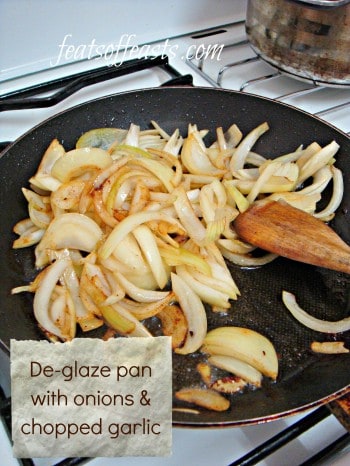 2. Dish out the browned beef and set it aside. In the same pan and oil, cook your onions and chopped garlic. Do not cook them until they’re soft, just de-glaze the pan till all the brown bits are coated in the onions.