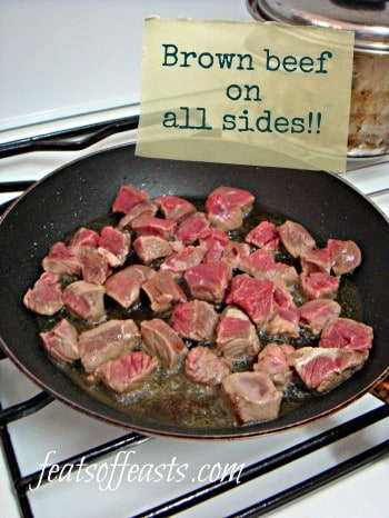 1. Cut the beef into cubes and pat them dry with paper towels. Heat olive oil in pan and brown beef cubes on all sides. I still do this even though I’m using the crockpot because I think browning them gives awesome flavour.