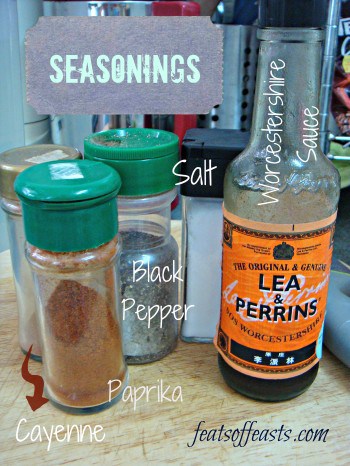 5. Season with Worcestershire sauce, paprika, cayenne, black pepper and salt. Don’t add too much salt at this point because you have other things that are salty. Adjust the seasoning at the end if you feel the need to.