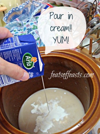 3. Open and pour the two cans of soup into the crockpot. Pour some warm water into the can and add it to the soup. Stir till you have a rather thick cream consistency. Pour in the cream. It is cream of mushroom after all.