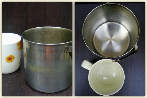 1. Line a stainless steel mug of considerable size with foil, make sure the foil is overflowing from the rim. I was using something of that sort and size (pic below, the cup is there for comparison) with a diameter of 5 inches;