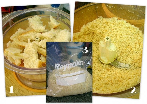 I was actually pacing back and forth wondering if I should do a post on this…making breadcrumbs hardly requires a recipe, least of all brain matter but somehow because the theme is stale bread week, I thought I should just include it for the benefit of those who are really clueless in the kitchen. If you ever have leftover bread that you can’t finish within the said date or even that skin part of white bread that we always leave out, don’t throw it away….make them into breadcrumbs and they’ll keep even longer.