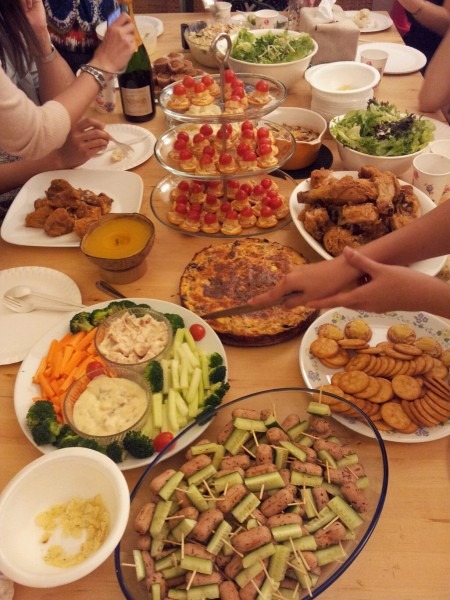 3rd row; Salad, tucking in, Festive booze, chocolate fountain waiting to be fired up….