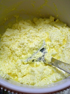 3. In a large bowl, cream together the butter, cream cheese, and sugar until light and fluffy. Beat in the eggs one at a time, then stir in the vanilla (I omitted the almond essence for this cake).