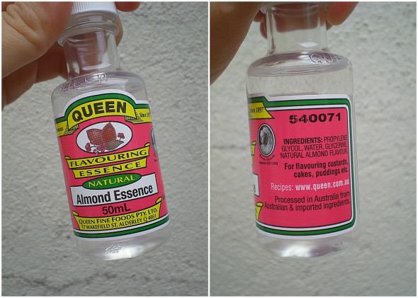 Now you might think that I’m going to diss this culprit for all it’s worth but I think to be fair, I’ll review this more as an informative piece. Looking at the ingredients in the essence (below), it has glycerine, propylene, glycol, water and almond flavour. When I looked up information for the main 3 chemicals, I found that glycerine is what they use as an emulsifier in some products and also to make soap. Why is there glycerine in the essence? Beats the hell out of me….I suppose it has its function for some other baked dishes. But the label there says for cakes, custards and puddings…all dishes that are liable to split because of some form of dairy in it.