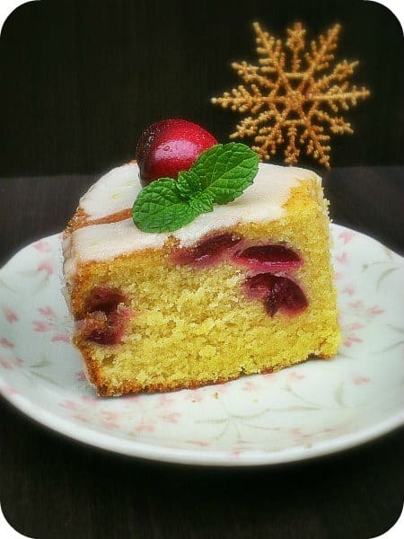 10. Drizzle the cake with the glaze and arrange fresh cherries on top. Add a sprig (or more) of mint leaves. Dust liberally with icing sugar.