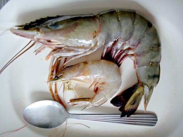 Tiger prawn, larger than an ordinary tablespoon and a normal-sized prawn