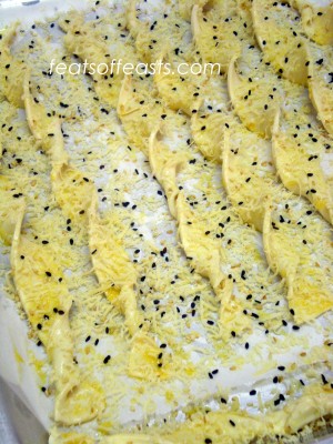 I used the puff pastry squares for this. I used 4 pieces of squares, attach them together at the edges to make a big square and then just cut them into strips. I used the squares mainly because I don’t need to roll it out anymore and the thickness of it is just nice for these cheese twists. I used to love going to bakeries and getting those long cheese-bread thing but lately, it’s more bread than cheese. So this was a real nice alternative. I purposely scatter the cheese beyond the sides so when you pick the twists up after they’re baked, you’ll get this nice layer of parmesan crisps or Frico and trust me, they’re really addictive!
