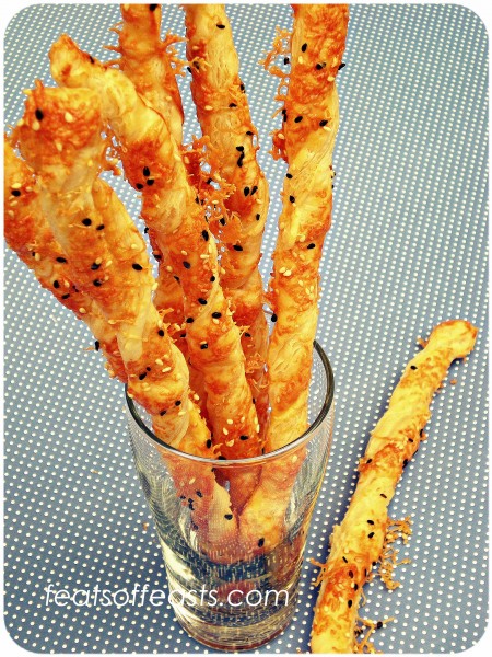 4. Carefully twist each strip till they look like coiled ribbons. Then place them on the baking tray. Once you’ve twisted all the strips of puff pastry and line them on the tray, brush each strip with egg wash but don’t be fastidious about it, it’s more for the cheese and seeds to adhere to the twists (below).