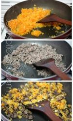 - Dish out the carrot and onion, pour more olive oil into the pan, sautee the beef mince till it reached almost a crispy consistency. You want the beef mince to cook rather dry and it loses the greyish colour.