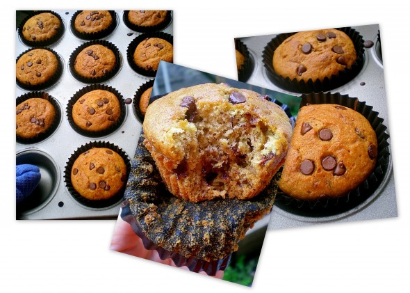 Because of his flu, he’s having difficulty breathing so he’s been waking up in the middle of the night and gets all moody in the morning due to lack of sleep. To cheer him (and probably myself) up a little, I made a batch of his fav banana choc chip muffins (below).