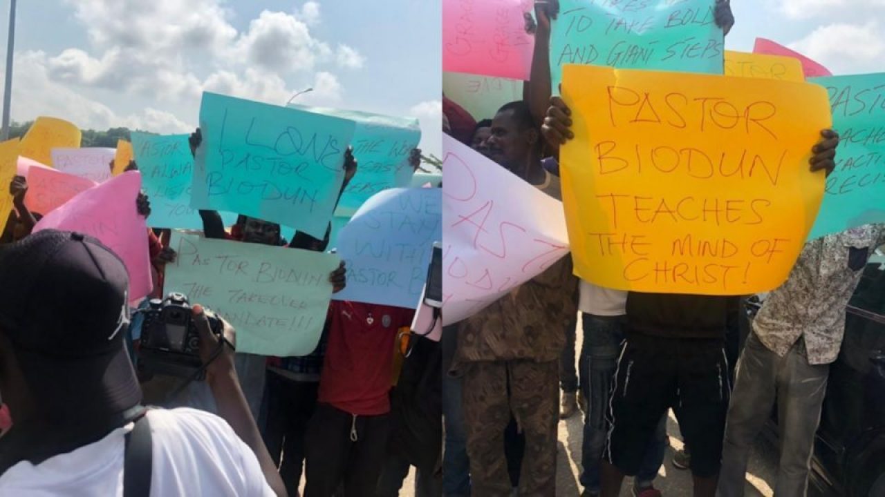 Some of the placards has inscriptions which read: “I love Pastor Biodun,” and “Pastor Biodun teaches the mind of Christ,” among others.