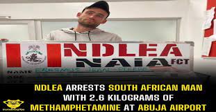National Drug Law Enforcement Agency on Wednesday, August 23 arrested a South African man, Erasmus Jean Pierre, 29, in an attempt to export 2.6 kilograms of methamphetamine concealed in his luggage to the Middle East through the Nnamdi Azikiwe International Airport, Abuja.