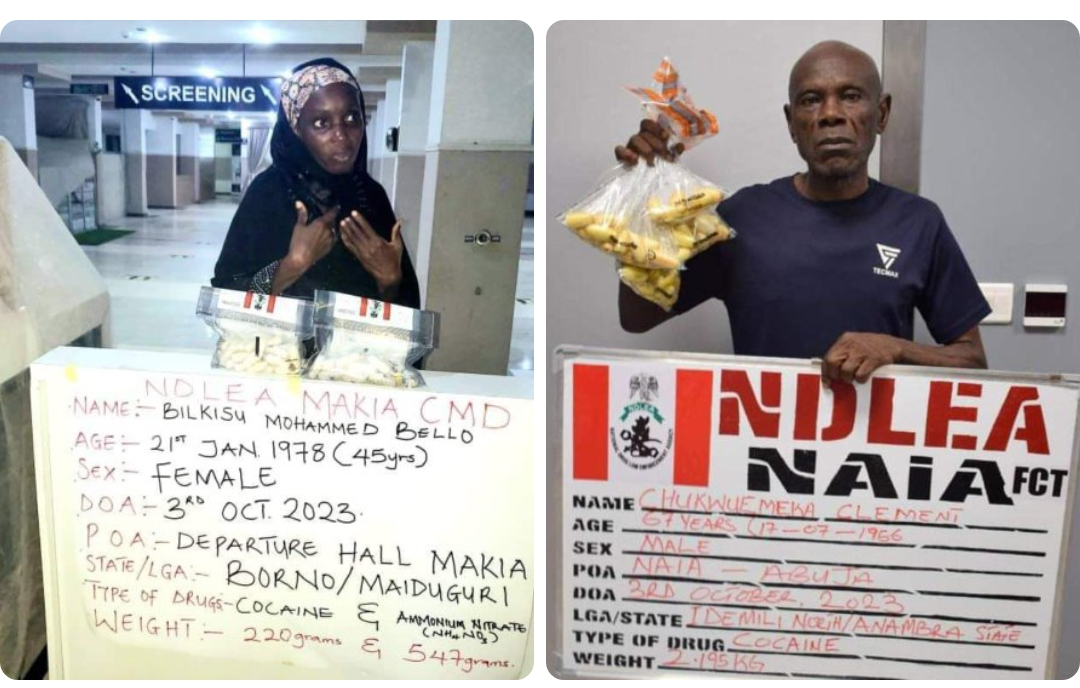 The NDLEA arrested a 67-year-old drug trafficker, Clement Chukwuemeka at the Nnamdi Azikiwe International Airport, Abuja on Oct. 3 for ingesting 100 wraps of cocaine.