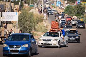 Some walked while others drove, with belongings strapped to the roofs of their trucks, cars and carts pulled by donkeys.